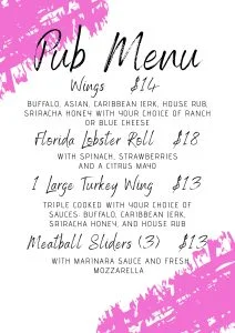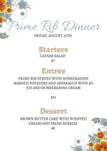 Wednesday Pub Night • 4:00 – 8:00 PM August Take Out Menu – Tuesdays • 4pm-6pm August Friday Night Dinner Friday, August 25th • 5:00pm – 8:00pm