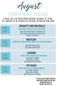 Wednesday Pub Night • 4:00 – 8:00 PM August Take Out Menu – Tuesdays • 4pm-6pm August Friday Night Dinner Friday, August 25th • 5:00pm – 8:00pm