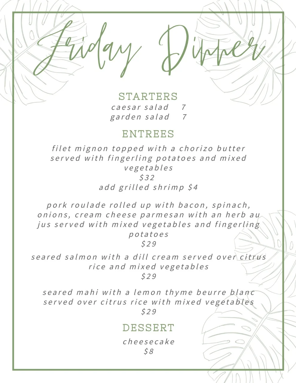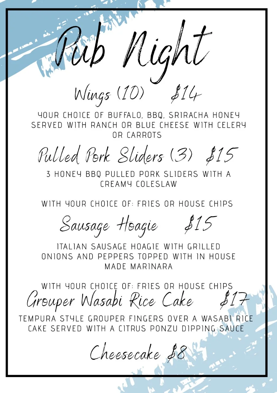 Weekly Dinner Hours WEDNESDAY PUB NIGHT: 4:00 – 8:00 PM FRIDAY NIGHT DINNER: 5:00 – 8:00 PM SUNDAY BRUNCH: 9:00 AM – 3:00 PM
